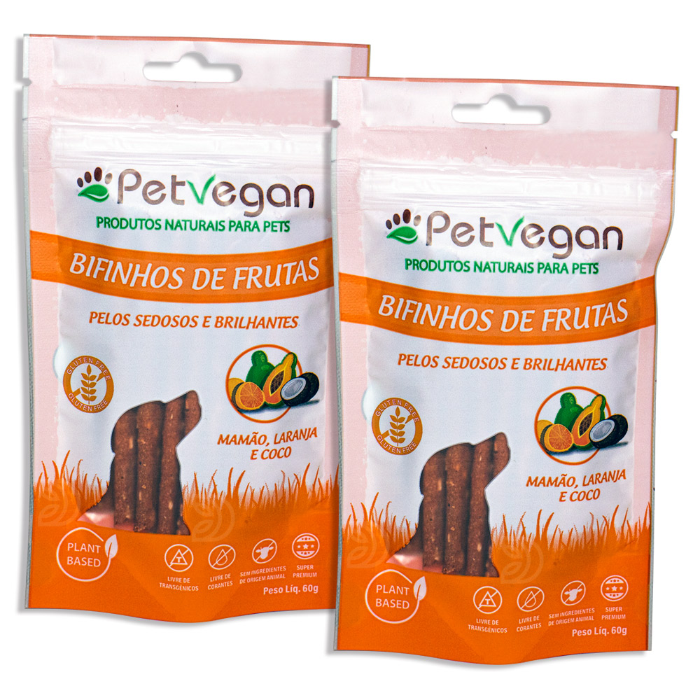 O Kit PetVegan Bifinhos Frutas com 2 unidades foi desenvolvido por veterinário especialista em nutrição de cães com alergias e sensibilidade intestinal. Combinando mamão, laranja e coco, cada unidade oferece fibras, vitaminas e minerais essenciais que favorecem a digestão, aumentam a energia natural e tornam a rotina do seu pet mais equilibrada e saborosa. Um cuidado diário em dobro, pensado para cães que precisam de atenção especial à saúde intestinal.